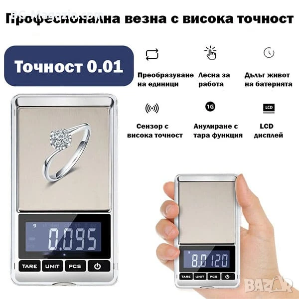– Прецизност без компромис: Измервайте с увереност благодарение на високата точност до 0.01 грама.