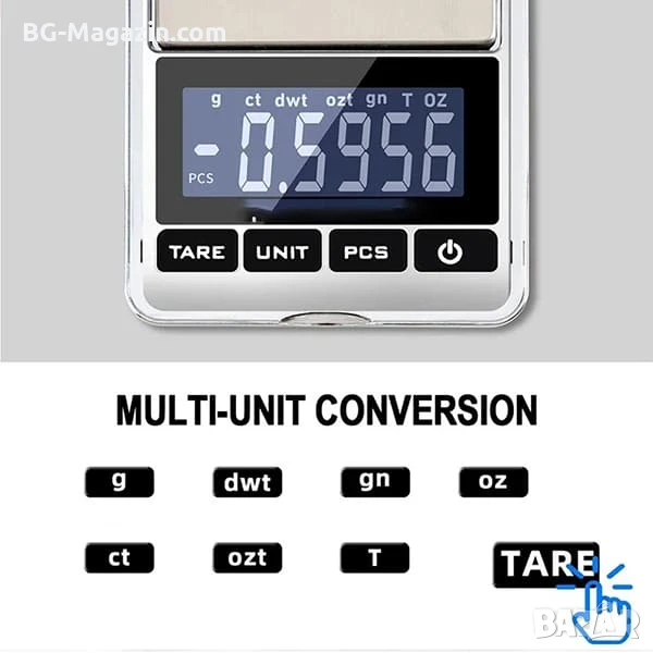 – Множество мерни единици: Лесно превключвайте между грамове (g), унции (oz), карати (ct), и грейн (gn), осигурявайки съвместимост с различни приложения и стандарти.