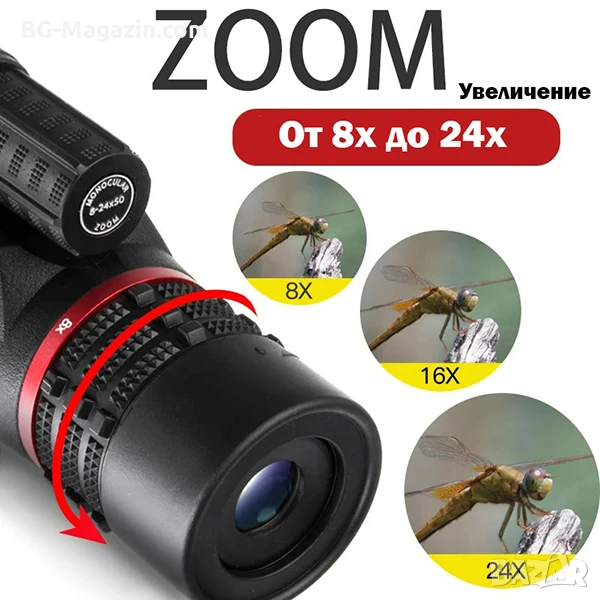 – Променливо увеличение: Наблюдавайте обекти на различни разстояния с променливото увеличение от 8 до 24 пъти.