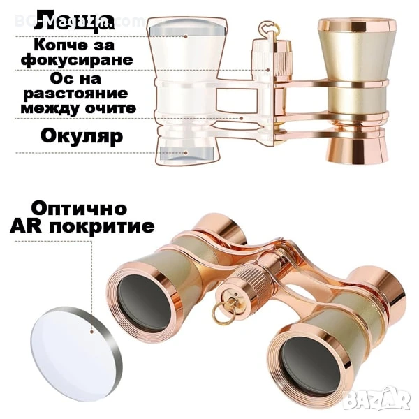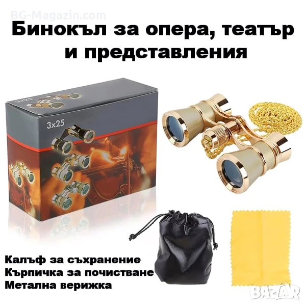 Превърнете всяко събитие в незабравимо преживяване с нашия елегантен златист бинокъл за театър 3х25! Този стилен и компактен бинокъл е перфектният избор за театрални постановки, оперни спектакли, концерти и всякакви културни изживявания. Със своето изтънчено излъчване и невероятна оптична прецизност, той ви позволява да се наслаждавате на кристално чисти изображения и да уловите всеки детайл, без да пропуснете нито един момент на сцената.