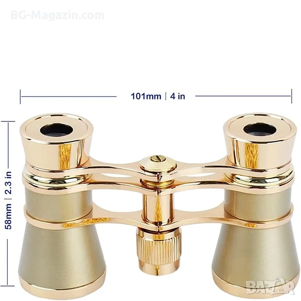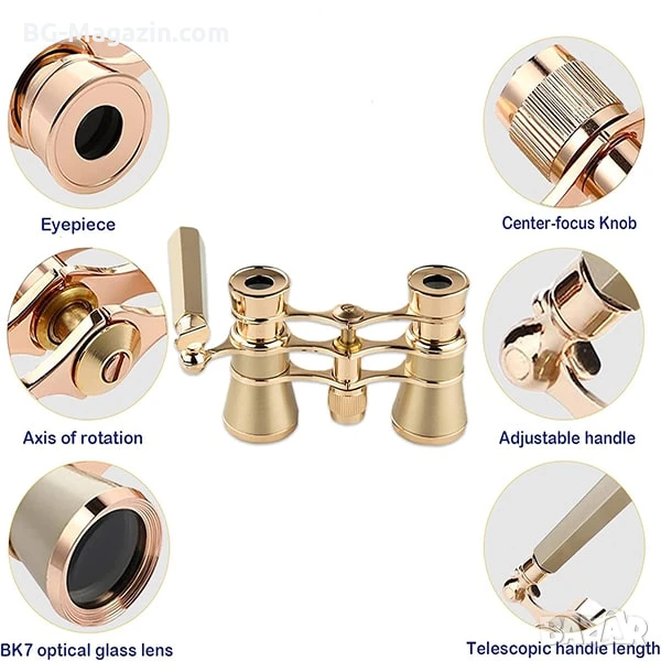 – Блясък и елегантност: Златистият цвят придава на бинокъла изтънчен и луксозен вид, превръщайки го в стилен аксесоар, който допълва всяко облекло.