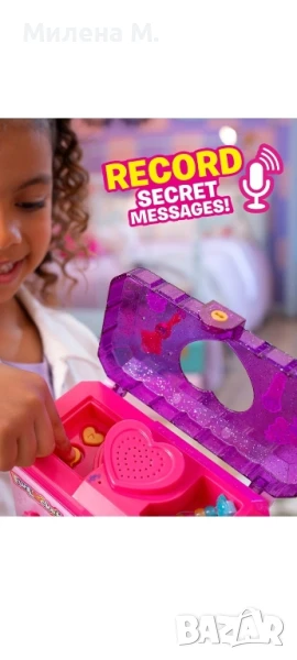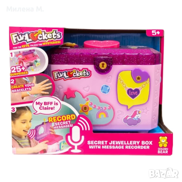 Funlockets кутия за бижута с рекордер за съобщения.Внос Англия 🎀 Общ прегледFunlockets е стилна и иновативна детска кутия за бижута, предназначена за деца от около 5+ години. Изработена е от здрави пластмаси (ABS и PP), което я прави подходяща за дълготрайна употреба .🔐 Тайни и забавленияКутията съдържа четири специални чекмеджета, които се отключват с ключета, награждавайки малкия откривател с над 25 скрити изненади – мъниста, метални талисмани, ленти, стикери, перли и други аксесоари .Целият процес е като мини приключение: намери ключетата, отключи всяко чекмедже и открий следващата изненада.🎙️ Рекордер за гласови съобщенияВ кутиите има вграден таймер, който позволява да записвате и слушате гласови съобщения – чудесен начин да оставите “секретно” послание за приятел или да придадете персонален характер на подаръка .Можете да презаписвате съобщенията толкова пъти, колкото пожелаете.🎁 Креативни функцииДецата могат да сглобят собствено бижу, използвайки включените талисмани, ленти и мъниста.Кутиите идват с комплекти стикери, които дават възможност да се персонализира външният вид според предпочитанията на детето .📏 Размери и технически характеристикиРазмери: приблизително 17,1 × 13,6 × 10,6 см .Тежи около 470 г.Работи с 2 × AAA батерии (не са включени) .Стил: модерен, с лъскав лак и атрактивен дизайн, предназначен да бъде център в детската стая.👧 За кого е подходяща?Идеална за деца на възраст от 5 до 10 години (и дори малко повече).Прекрасен подарък за рожден ден, Коледа.Спомага за развиване на въображението, сръчност и лично изразяване чрез персонализиране и запис на съобщения.