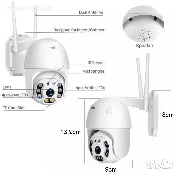 Чисто нови въртящи се на 355 градуса по хоризонтала и 90 градуса по вертикала (PTZ) безжични WIFI IP Full HD 1080p 5.0MP широкоъгълни камери с 3.6mm фокусно разстояние. Камерите са прахо и влагоустойчиви, покриват стандарт IP66, като могат да бъдат поставени и на открито.