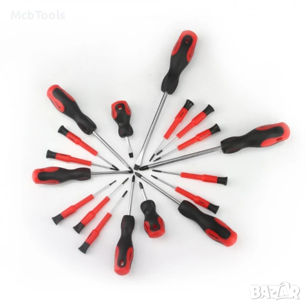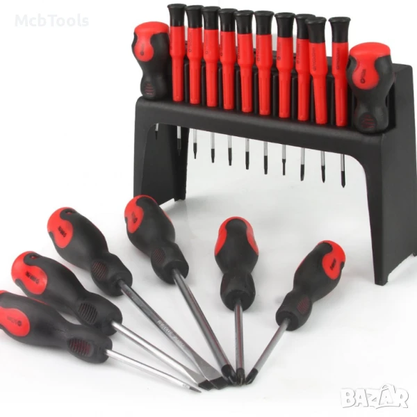 Комплект от 18 броя отвертки MAR-POL, изработени от хром-ванадиева стомана (CrV), осигуряваща здравина и издръжливост. Отвертките са компактно подредени на стоманена стойка, която има възможност за закрепване на стена. Върховете на отвертките са магнетизирани, което значително улеснява работата. Имат удобен и омекотен елемент на дръжката за по-удобен захват.