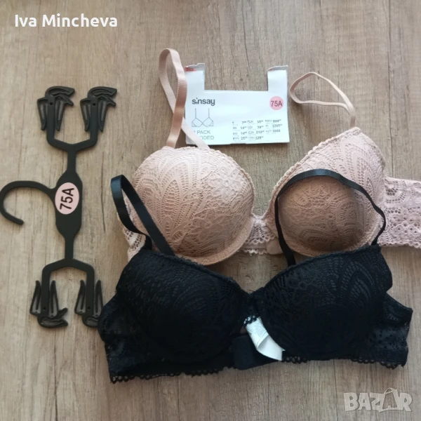 2 бр сутиени черен и среден цвят между розово и бежов цвят, нови с премахнат етикет, размер 75 А, дантела. Цена 14.90 лв/ 2 бр. Причина за продажба - не е точният размер за мен.