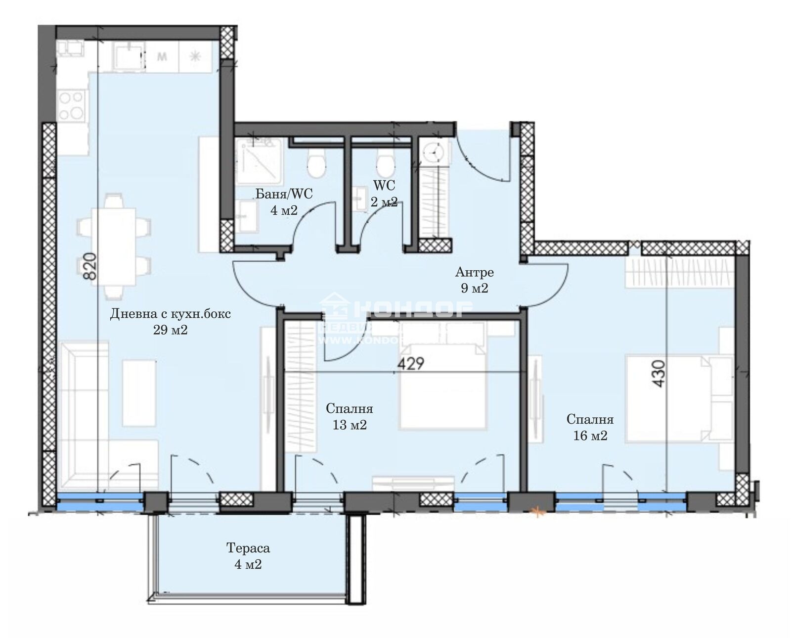 Оферта 65921: Предлагаме Ви възможността да закупите тристаен апартамент в новоизграждащ се луксозен жилищен комплекс с модерна визия, проектиран да създаде максимален комфорт на живущите в него. Функционално разположени жилищни секции с елегантен силует готов да предложи комфорт и модерен начин на живот. Едно от основните му предимства е страхотната локация, отлична комуникативност и динамична пътна инфраструктура, която осигурява бърз и лесен достъп до комплекса от всяка точка на града. Той съчетава лукс, спокойствие и комфорт с подсигурени паркоместа и гаражи. Жилището се състои от дневна /29 кв.м./ с кухненска част и трапезария, две самостоятелни спални 13 и 16 кв.м., баня с тоалетна, втора тоалетна, входно антре с място за перално и една тераса. Към апартамента има избено помещение, включено в цената! Основната концепция при проектирането е да се постигнат просторни и функционални стаи, с цел да се създаде максимален уют на модерното семейство. Изключителна съвременна архитектура и модерна технология на строителство. Визията е иновативна, привличаща внимание с уникалността си. Всяко жилище ще разполага с пълно окабеляване за домофон, интернет и кабелна телевизия, общите части са луксозно завършени, жилищата са с алуминиева дограма с троен стъклопакет от най-висок клас, масивна блиндирана входна врата. За удобство на живущите съществува възможността да закупят подземни паркоместа и гаражи с топла връзка към комплекса. Гъвкави схеми на разсрочено плащане спрямо възможностите на клиента в рамките на строителството или закупуване чрез Банков Кредит, на изключително изгодни условия за клиенти на агенцията !!! Приложените изображения са от завършени проекти на строителната фирма.ВИЖТЕ ОЩЕ ИЗГОДНИ ОФЕРТИ НА https://www.kondorimoti.com/ С ЕЖЕДНЕВНА АКТУАЛИЗАЦИЯ!