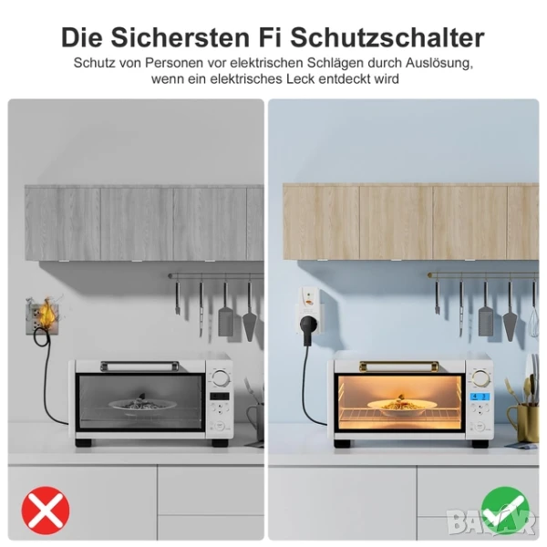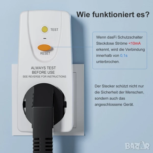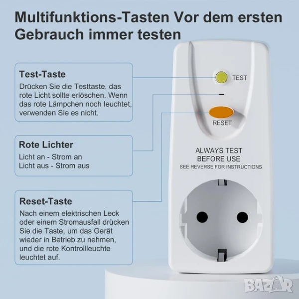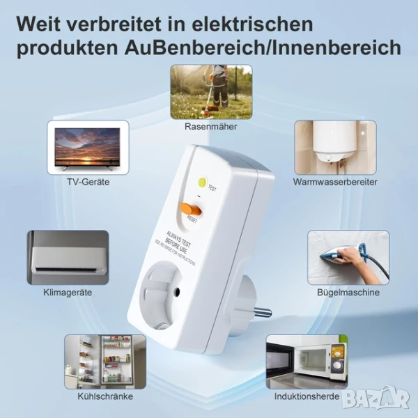 Fi предпазител, подходящ за всички европейски стандартни щепсели, с тестова верига и бутон за нулиране. Съвместим с електрически устройства (220-250 V AC, максимална мощност 4000 W), включително хладилници, микровълнови фурни, бойлери, климатици, електрически инструменти и др.
