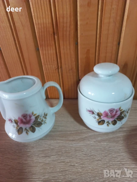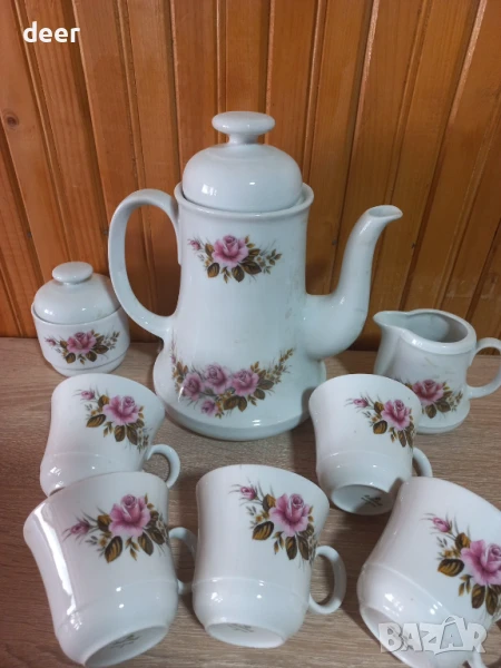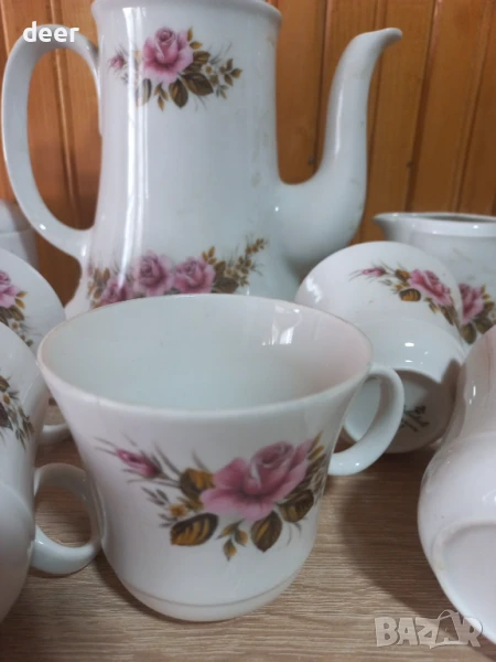 Качествен порцелан, чашите са без подложки, може да се използват за чай или кафе 5бр. чаши, кана, захарница и каничка за мляко