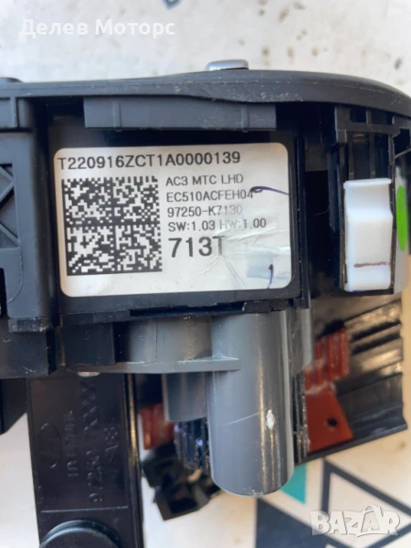 97250-K7130 управление за парно, климатик за Hyundai I10 1.0 MPI, двигател G3LD, скоростна кутия MN1671, 67 кс., 5 ск., 80000 км., 2023 г., Хюндай И10, Engine G3LD, gear box MN1671, 1.0 МПИ, 67 кс., 5 ск., euro 6D в автоморга Delev Motors, между с. Каменар и с.Куманово гр. Варна. ВСИЧКИ ЦЕНИ СА С ВКЛЮЧЕНО ДДС. ВСИЧКИ ЧАСТИ СА С 14 ДНИ ПРАВО НА ВРЪЩАНЕ. Изпращане на части чрез наложен платеж с ЕКОНТ с 30% отстъпка от куриерските услуги за цялата страна, получаване на следващият ден. Доставката и връщането е за сметка на КУПУВАЧА. Изкупуване на западни и японски автомобили, джипове и бусове след 2020 г. за части. Издаване на удостоверение за бракуване пред КАТ. Издаване на всички необходими документи за регистърация на двигател в КАТ. РАБОТНО ВРЕМЕ ОТ ПОНЕДЕЛНИК ДО ПЕТЪК от 9.00 ч. до 18.00 ч., ПОЧИВНИ ДНИ СЪБОТА И НЕДЕЛЯ. За контакти: 0897852371