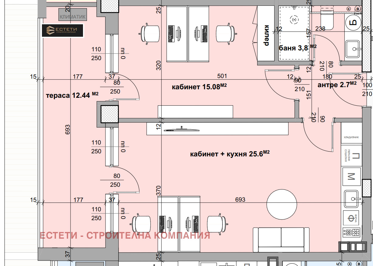 🏠 Ателие, състоящо се от: антре, кабинет с кухня, кабинет, баня с тоалетна,тераса. Квадратура: - 89 кв.м.