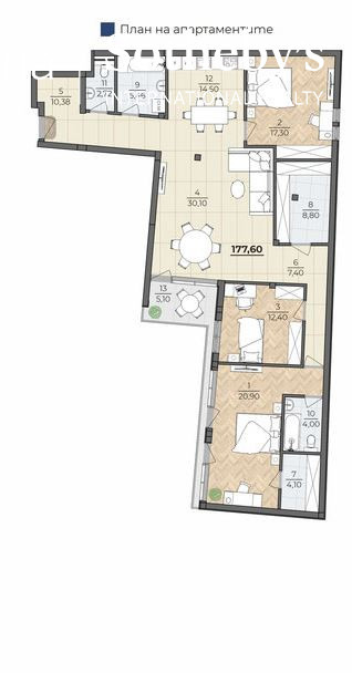 РАЗПРЕДЕЛЕНИЕ: входно антре, просторна дневна с кухненска част (~30 кв.м), родителска спалня със собствена баня и тоалетна, втора спалня (детска стая), трета спалня / кабинет, отделна баня, отделна тоалетна, складово помещение / гардеробна, тераса с морски изглед