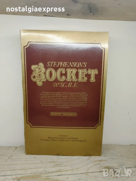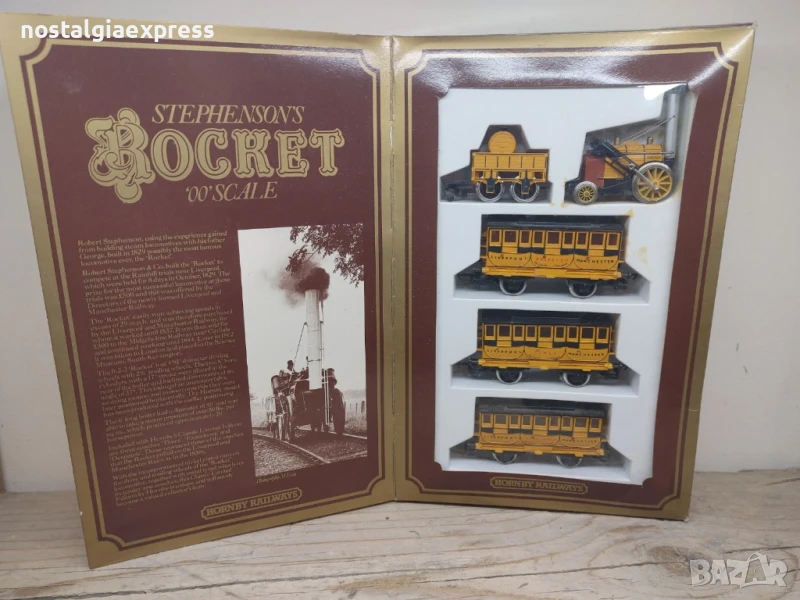 Комплекта включва модел на парен локомотив рокет с тендер и 3 пътнически вагона, подходящ за малък макет .