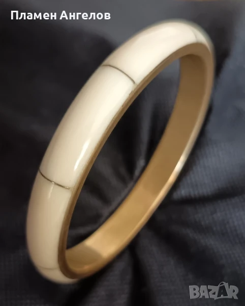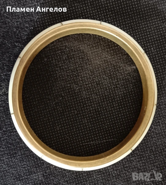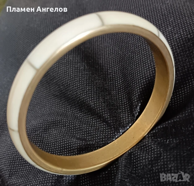 Винтидж секционирана дамска гривна от костен рог и месинг. Повечето срещани са със седеф, тази е различна-здрава, стабилна не се огъва. Ръчна изработка от костен рог на секций и теглен месинг. Без повреди, чудесно запазена-като нова. Идеално заоблена, без вдлъбнатени(изкривявания). Вътрешен диаметър 6.5 см.,широчена на стената, 1.1см.,дебелина на стената 6 мм.