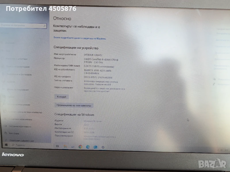 Козметични забележки. Използван само за писане на документи и търсене в интернет. Лицензиран Windows 10.
