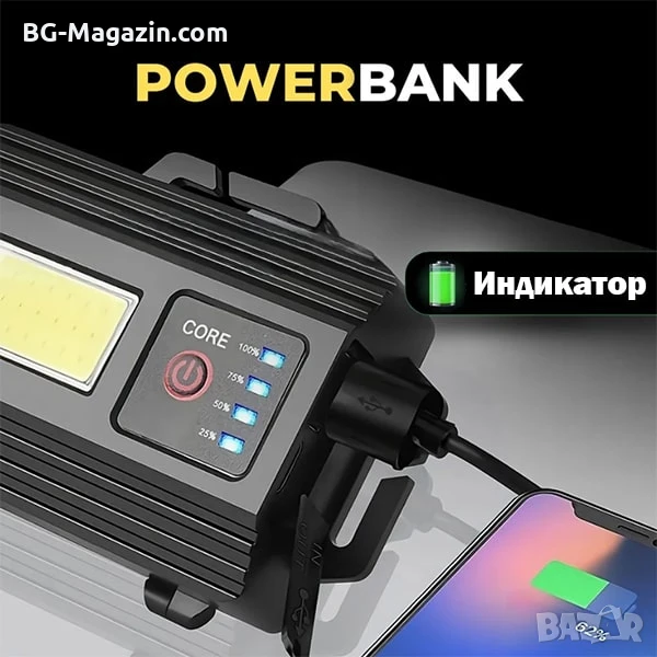 – Многофункционалност: Използвайте го като челник и Power Bank за зареждане на други устройства.