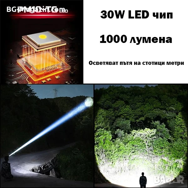 – Мощна и далекобойна светлина: CREE XML T6 LED чип и 30W мощност осигуряват невероятна яркост и обхват над 500 метра.