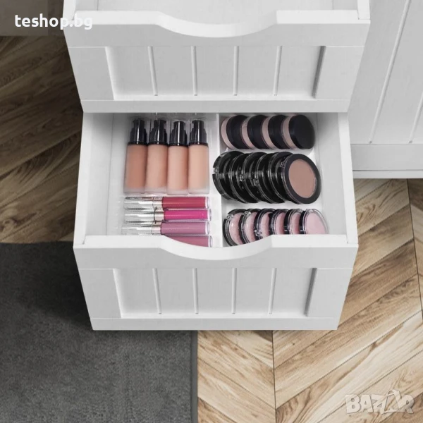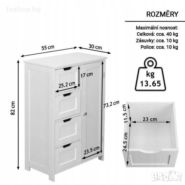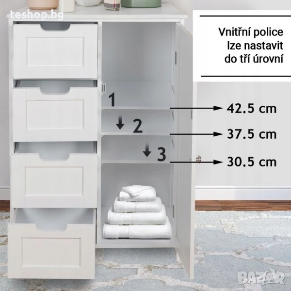 Правилната мебел може да окаже голямо влияние върху организацията и реда в едно пространство. Четирите просторни чекмеджета и двата рафта в този шкаф са повече от достатъчни за всички ваши нужди в банята, независимо дали става въпрос за грижа за кожата, грим, различни почистващи продукти или козметика. Този шкаф е изработен от издръжлива плоскост от дървесни частици със средна плътност, има класически стил и бял цвят, което го прави подходящ не само като шкаф за баня, но и като шкаф за коридора, спалнята, хола или дори кухнята. Вашите лични нужди.