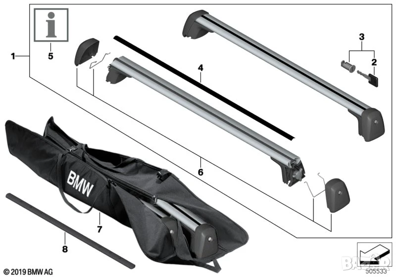 BMW сакът за съхранение на напречните греди, който се вижда на каталожната снимка, е отделен каталожен номер и не е в комплект с гредите.