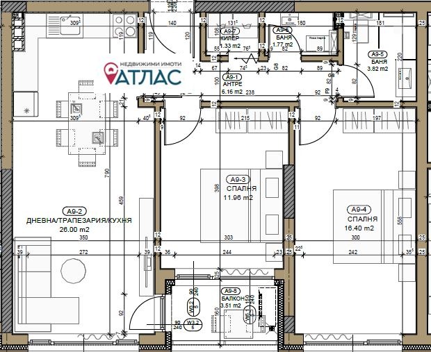 Разпределение: антре, килер, дневна с трапезарна част и кухненски бокс, две спални, баня с тоалетна, тоалетана и балкон с излаз от дневна и спалня.