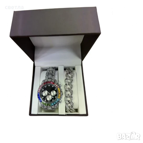 Богато златно покритие, блестящи инкрустации по цялата верижка и корпус. Безел с цветна дъга от кристали, черен циферблат със златни стрелки. Гривна в златен цвят с богато обсипани камъни за завършена визия.
