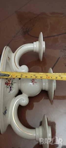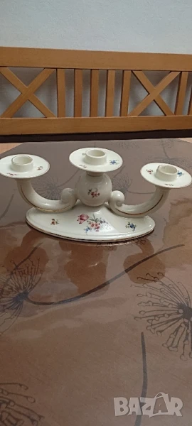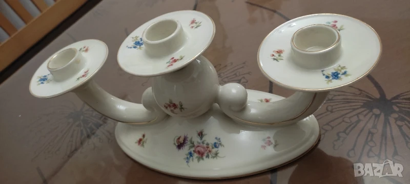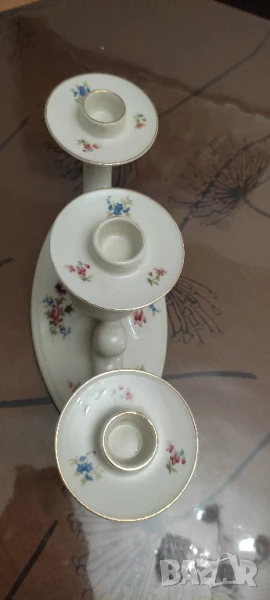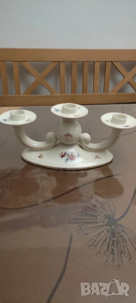 Порцеланов свещник с 3 гнезда. С маркировка на Alka Bavaria Meissen. Размери : дължина около 29 см. Дължина в основата 21,5 см. Височина в центъра 12 см., височина в краищата 10 см. Ширина 11 см. Забележка- протриваме на златния кант в средното гнездо.