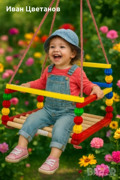 Цветна класическа люлка, създадена както за игра на открито, така и за забавления на закрито. Подходяща е за монтаж в двора или за закачане на тавана у дома. Люлката съчетава традиционна дървена конструкция с ярки, весели цветове, които привличат вниманието и радват децата.