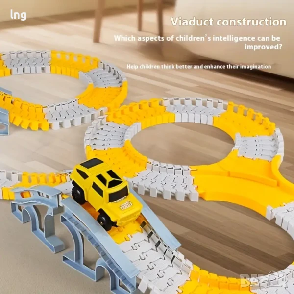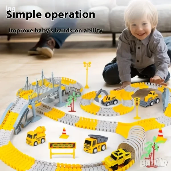 Продавам детски строителен състезателен трек с камиони, идеален за малки инженери и любители на автомобили! Този забавен комплект ще осигури часове игра и креативност за вашето дете.