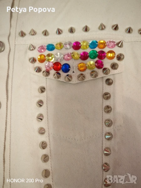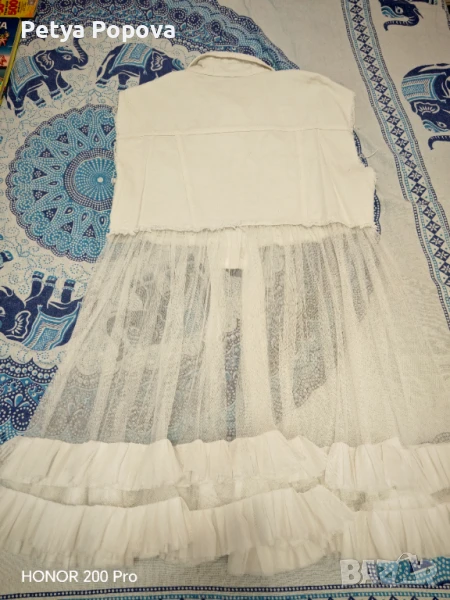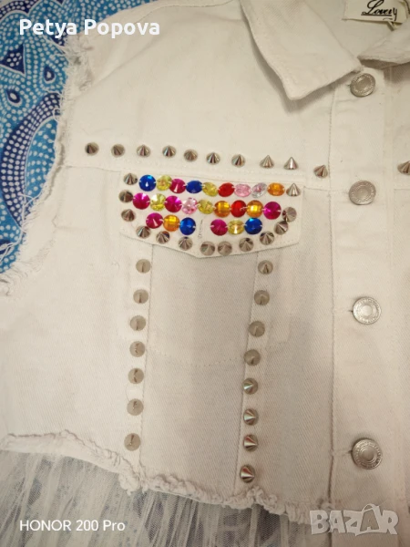Туника в горната част бял дънков плат, нашита с камъни. В долната част тюл. Без забележки. Може да се носи с дънкови панталонки, дълъг панталон.