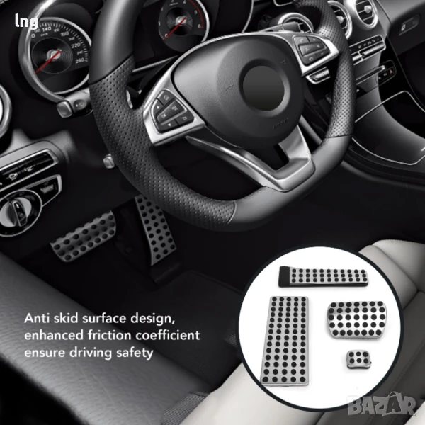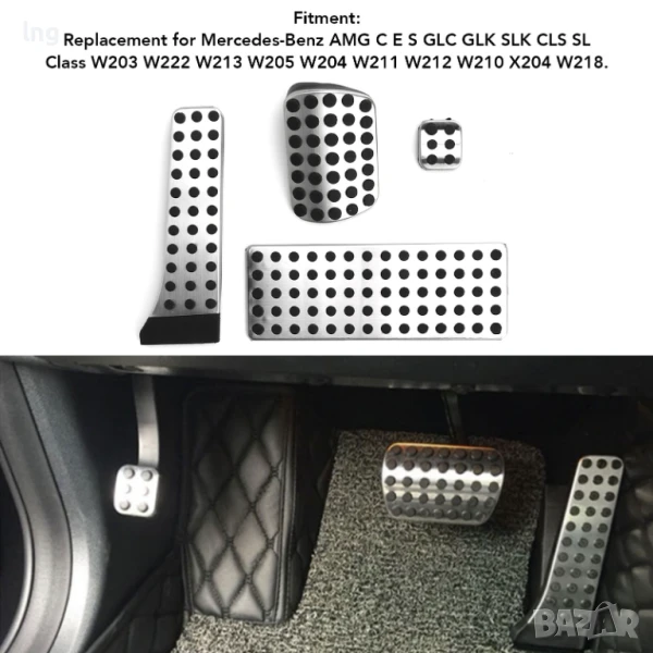 Продавам висококачествен комплект спортни накладки за педали, изработени от неръждаема стомана с дизайн против приплъзване. Този комплект е специално предназначен за широк кръг модели Mercedes-Benz (C, E, S, GLC, GLK, SLK, CLS, SL Class), включително AMG версиите, и е идеален за тези, които искат да добавят спортен вид и подобрено сцепление към интериора на своя автомобил.