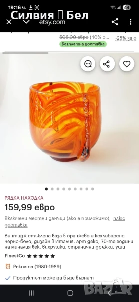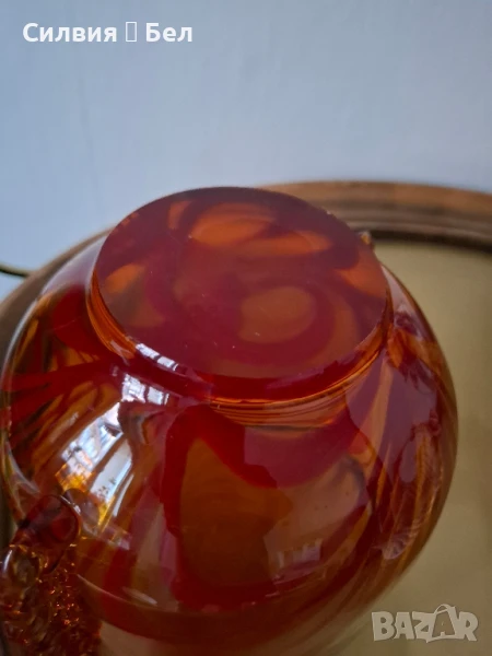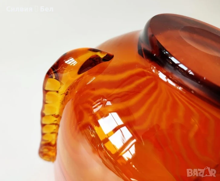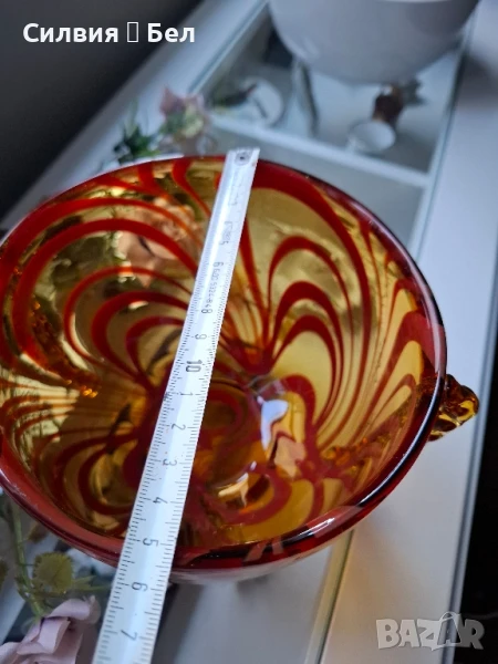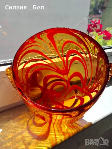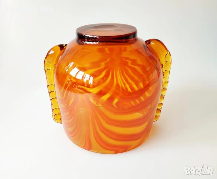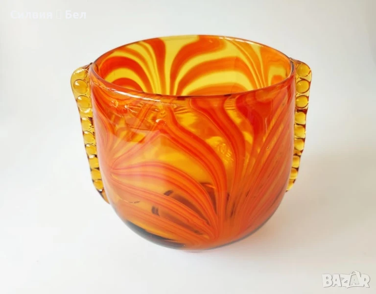 •✽✧✽•°”˜🦋”°•✽✧✽•°”˜🦋”°•✽✧✽•°”˜🦋”°•✽✧✽•°”🦋˜”°•✽✧✽•Красиво❗️Масивна, тежка, ретро, ръчно духана стъклена ваза, купа.....Оранжево/жълто/кехлибарено/вихърно, градиент.Динамична форма със странични дръжки.Кръгли копчета са вградени в дръжките/ушите.Леко конична форма в стил Арт Деко с краче.•✽✧✽•°”˜🦋”°•✽✧✽•°”˜🦋”°•✽✧✽•°”˜🦋Стъклено изкуство от 70-те години.- Ширина- Височина 14 см.- Диаметър на горната част, включително дръжките, приблизително 18 см.- Диаметър на долната част, включително дръжките, приблизително 16 см.- Дъното е ръчно шлайфан.- Състоянието е отлично запазено. Без забележки. Цена 1️⃣2️⃣0️⃣лв.•✽✧✽•°”˜🦋”°•✽✧✽•°”˜🦋”°•✽✧✽•°”˜🦋”°•✽✧✽•°”🦋˜”°•✽✧✽•