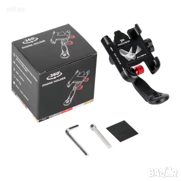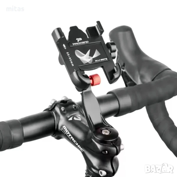 Алуминиева стойка за телефон с монтаж на вилка и ротация на 360 градуса.