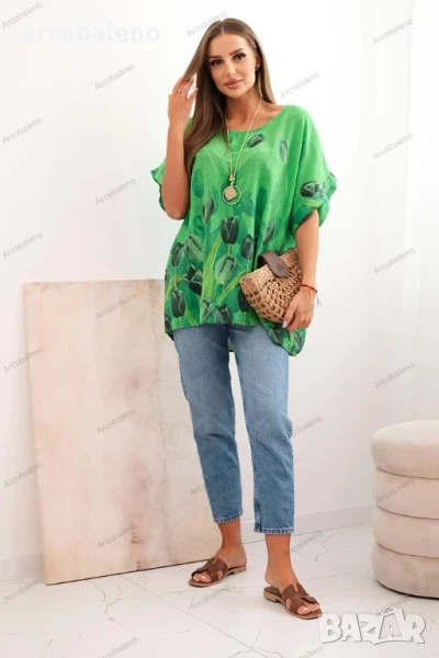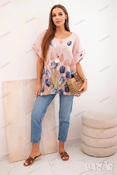 Търсите лека, ефирна блуза, идеална за по-топлите дни? Тази дамска блуза с къс ръкав съчетава естествен комфорт с изключителен стил. Изработена от 100% памук, тя очарова както с меката си материя, така и с красивия мотив на лале в долната част. Свободната кройка прилепва приятно по тялото и осигурява пълна свобода на движение, независимо от повода. Това е чудесен избор както за ежедневни излизания, така и за събирания с приятели. В комбинация с любимите ви дънки или пола, ще създадете визия, която ще привлече вниманието. Флоралният мотив добавя свежест и женствен чар, а класическото деколте тип „лодка“ и късите ръкави я правят много удобна за носене. Размерът е универсален и е подходящ за жени, носещи размери S, M или L.