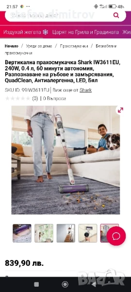 Вертикална прахосмукачка и замърсявания, QuadClean, Антиалергеннa, LED, БялзабележShark IW3611EU, 240W, 0.4 л, 60 минути автономия, Разпознаване на ръбове.Забележка липсва приставката за ъгли и малката четка .Представяме ви Detect Pro - най-интелигентната серия прахосмукачки на Shark. Тази ултралека безжична прахосмукачка за дълбоко почистване интелигентно се адаптира към всяка бъркотия и се изпразва сама.Основни предимства:- До 50% по-добро събиране на мръсотията: Четири технологии за дълбоко почистване откриват и реагират на заобикалящата ги среда, проследявайки всяка скрита бъркотия в дома ви:- DirtDetect: Открива невидими замърсявания и автоматично увеличава всмукателната мощност за дълбоко почистване на килими- EdgeDetect: Засича ръбовете и удвоява всмукателната мощност за по-ефективно почистване на ръбове и ъгли- FloorDetect: Автоматично разпознава вида на пода и оптимизира работата, като увеличава скоростта на четката за дълбоко почистване на килими- LightDetect: Реагира на зони с ниска осветеност, като автоматично осветява скритите прах и замърсявания- Самоизпразваща се база: Изключително голямата 2-литрова база за автоматично изпразване задържа мръсотията и остатъците до 45 дни. Просто поставете прахосмукачката на основата след всяко почистване и тя автоматично ще се изпразва- Антиалергенно уплътнение: Улавя и задържа 99.9% от праха, алергените и дразнителите в основата, като не ги изпуска обратно в дома ви. Технологията Anti-Odour предпазва от миризми вътре в основата за по-свеж мирис в дома- До 60 минути работа: Зарежда се, докато се съхранява на свободностоящия док, винаги готова за следващото почистване. Лесно преносима, без нужда от фиксирана станция за зареждане- Дълбоко почистване на килими и твърди подове: Ролката с четка QuadClean почиства в дълбочина всички видове подове без смяна. Уникалният дизайн включва повдигнат преден ръб за изтегляне на големи замърсявания, перки за килими за повдигане на забити замърсявания и косми, разбъркващи ребра за разхлабване на фини замърсявания и меки микрофибри за улавяне на фин прах- Технология Anti Hair Wrap: Премахва космите от ролката на четката по време на почистване, предотвратявайки заплитането им - идеална за домове с домашни любимци- Мощна производителност и лекота: Компактният двигател с турбозадвижване осигурява мощно почистване в тази ултралека, самоизпразваща се безжична прахосмукачка- LED дисплей: Показва в реално време състоянието на батерията, откриване на замърсявания и режимите на почистване- Почистване на целия дом: Лесно достигайте под ниско разположени мебели с пръчката Flexology. Отделете ръчната прахосмукачка, за да почистите стълби, мека мебел, вътрешността на автомобила и труднодостъпни места с лекия ръчен вакуум и 2 приставки - инструмент за премахване на косми от домашни любимци и инструмент за прах- Максимална мощност: 240 W- Капацитет на контейнера: 0.4 л - Капацитет на станцията: 2 л- Размери: 26.4 × 35.3 × 109.2 см- Тегло: 4.1 Kg- Автономност: До 60 минути- Измиващ се филтър- Време за зареждане: 4.5 часа- Технологии за почистване:DirtDetectEdgeDetectFloorDetectLightDetect- Капацитет на основата: 2 л- Anti-Allergen Complete Seal- QuadClean ролка- Anti Hair Wrap технология- LED дисплей- Цвят: Бял