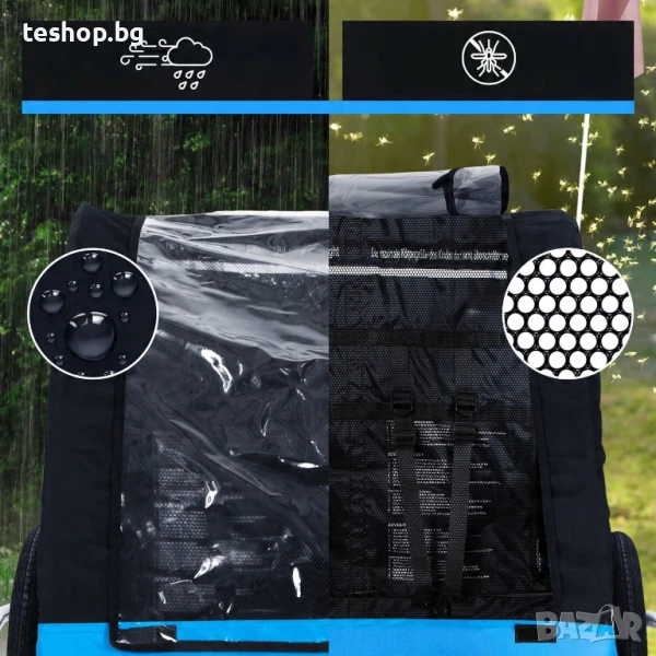 ИЗДРЪЖЛИВ: Тръбната стоманена рамка и издръжливата оксфордска материя правят детското ремарке за велосипед устойчиво на ежедневно износване, докато PVC ролката предпазва пътниците от дъжд, а мрежата против комари държи насекомите далеч.