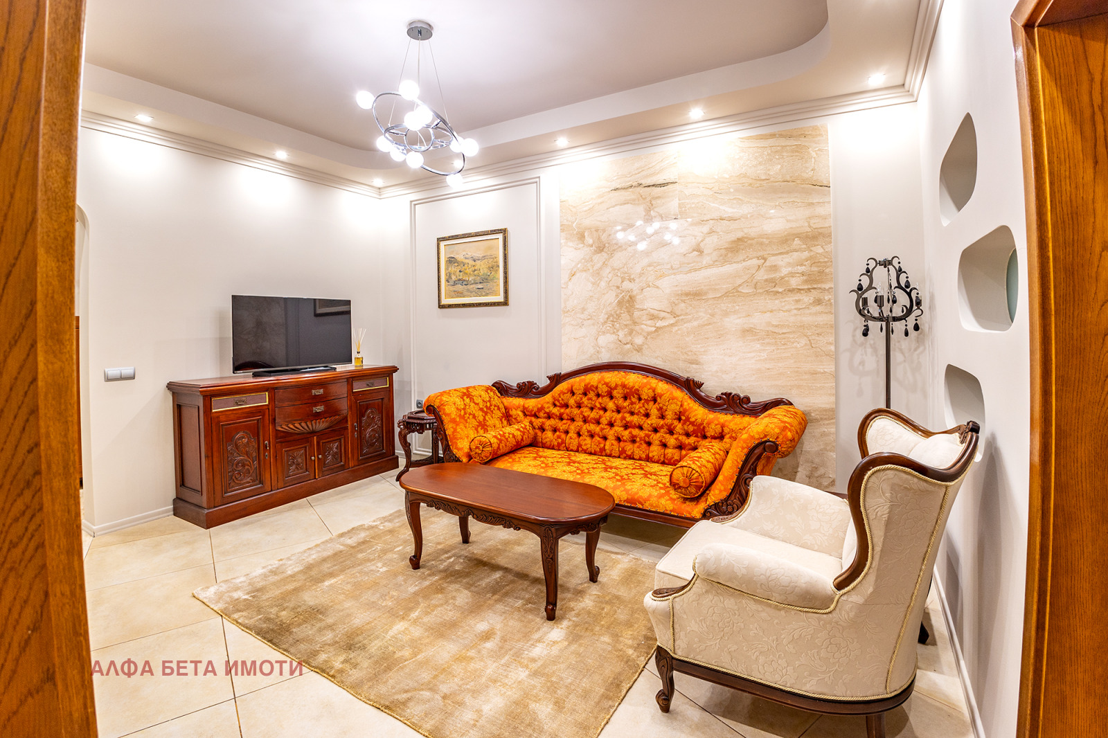 В главната спалня е разположено двойно легло от масив, размер 180/220, гардеробна стена и елегантен диван.