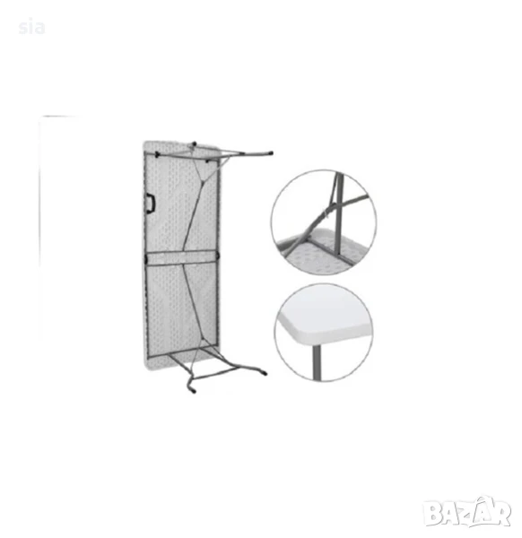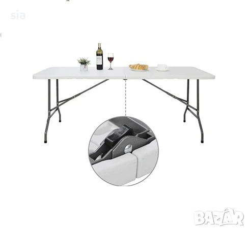 сгъваема маса за къмпинг,градина или за терасата на вашия дом.С елегантният си дизайн и солидната структора я прави издръжлива и стабилна.Плотът е направен от екологичен материал,лек полиетилен със защита от слънчеви изгаряния и устойчивост от вредни влияния.Почиства се лесно.Сгъваемия и заключващ се механизъм я прави лесно преносима за всякакви събития и събирания на открито и закрито.