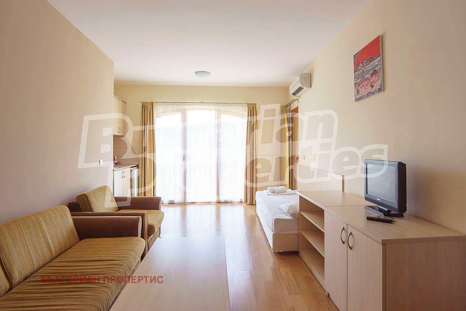 гостна с разтегателен диван и фотьойл;