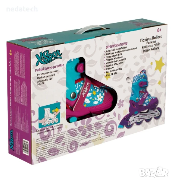 Детски ролкови кънки за момичета с регулируем размер. Имат PVC изкуствена кожа и мрежа от външната страна, мрежеста подплата и EVA, алуминиева рамка, лагери от стомана 608Z и PVC колела 70x24 мм. Имат PP спирачки. Минимално тегло на потребителя: 20 кг.
