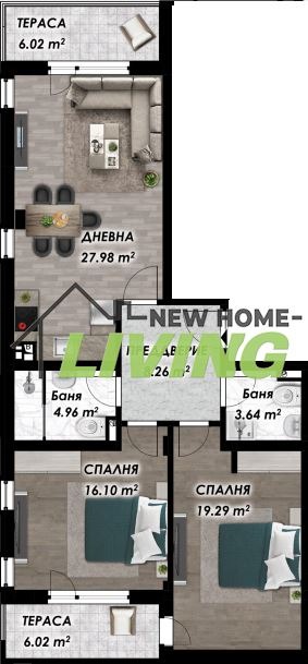 ➡️ Жилището е със следното разпределение : просторно входно антре, светъл хол , две спални , две бани с тоалетни и две тераси . Уникален апартамент с три изложения и панорамна гледка към Родопите .