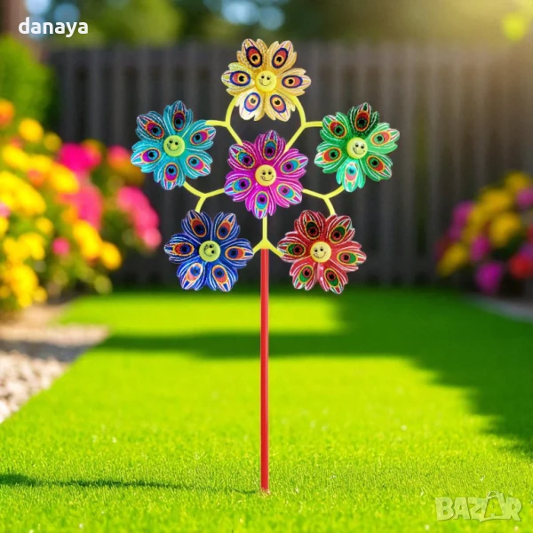 Внесете настроение и цвят в двора или на терасата си с тази декоративна градинска въртележка с 6 цветни, усмихнати цветя! Със своето ярко излъчване и весели лица, тази вятърна въртележка е идеалният акцент за всяка градинска декорация. Подходяща е за поставяне в саксии, тревни площи или близо до пътеки, като се върти дори и при лек вятър.