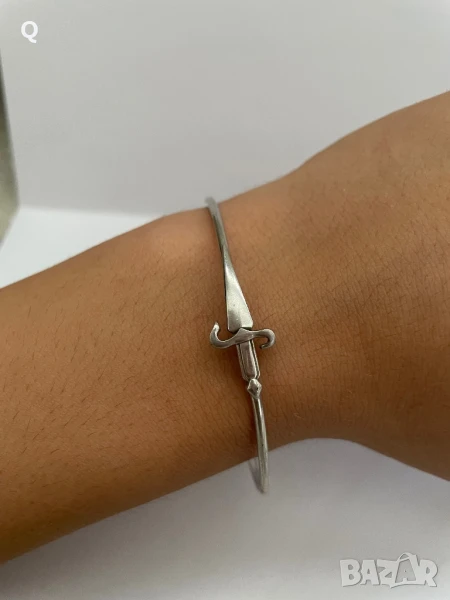 Тази сребърна гривна е елегантен и минималистичен аксесоар с интересен декоративен елемент във формата на малък кинжал или сабя. Гривната е тънка и твърда, с плавно извита форма, като кинжалът е изработен с внимание към детайла – включително гардът с декоративна извивка. Подходяща е за ежедневно носене или като стилен акцент към по-специален тоалет.
