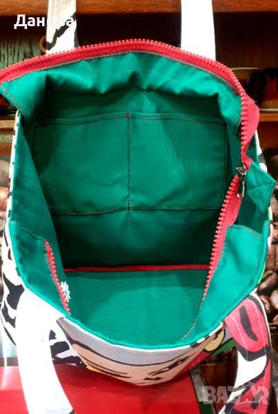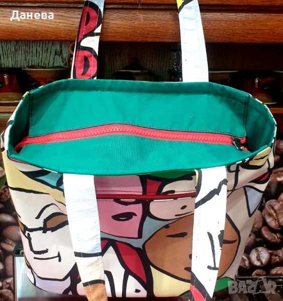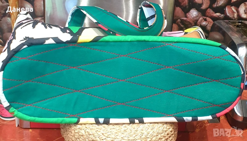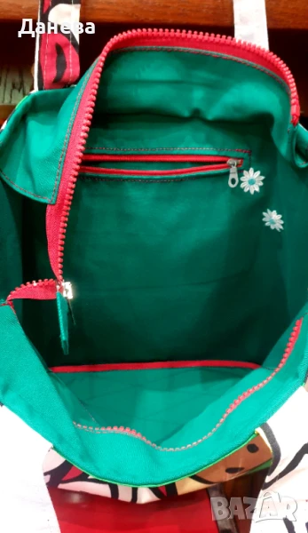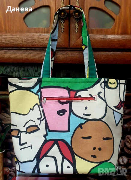 Дамска чанта от плътен и здрав плат.Размери-широчина 48см.,височина 36см. и дъно 13см.Чантата е тип торба с твърдо дъно,става и за плажна чанта.Може да се пере в пералня на 30 градуса.