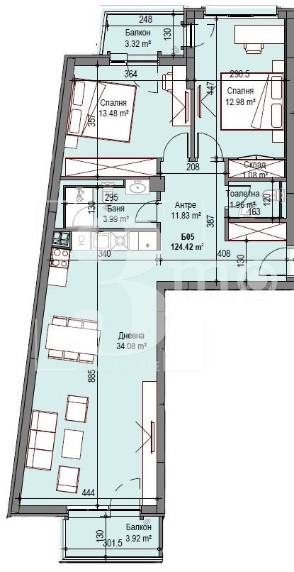 '3mo' недвижими имоти продава тристаен апартамент в кв. Сухата река. Имотът се намира на втори етаж и се състои от: дневна с кухненски бокс (34,08 кв.м.), две спални (13,48 кв.м. ; 12,98 кв.м.), антре (11,83 кв.м.), балкон (към дневната, 3,92 кв.м.), втори балкон (към спалните, 3,32 кв.м.), баня с тоалетна (3,99 кв.м.), отделна тоалетна (1,96 кв.м.) и склад (към едната спалня, 1,08 кв.м.). Общата площ на апартамента е 124,42 кв.м., от които застроената площ е 106,02 кв.м. Отопление: изводи за климатици във всяка стая; радиатори ТЕЦ; подово отопление в баните.