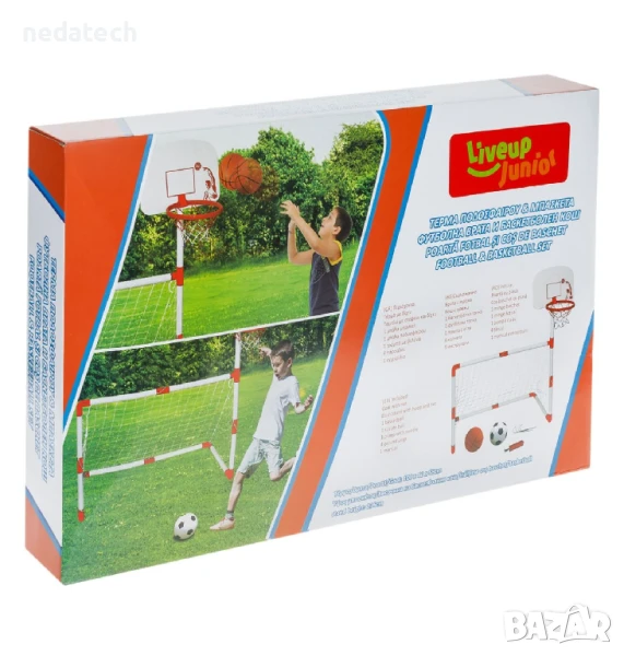 Футболна врата с пластмасова рамка и бяла мрежа. От едната страна на вратата има баскетболна топка с диаметър 136 см. Тя има 4 колчета за закрепване на земята и инструкции за сглобяване. Пакетът съдържа врата с мрежа, табло с кош и мрежа, баскетболна и футболна топка, помпа с игла, 4 колчета и инструкции.