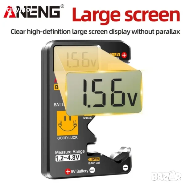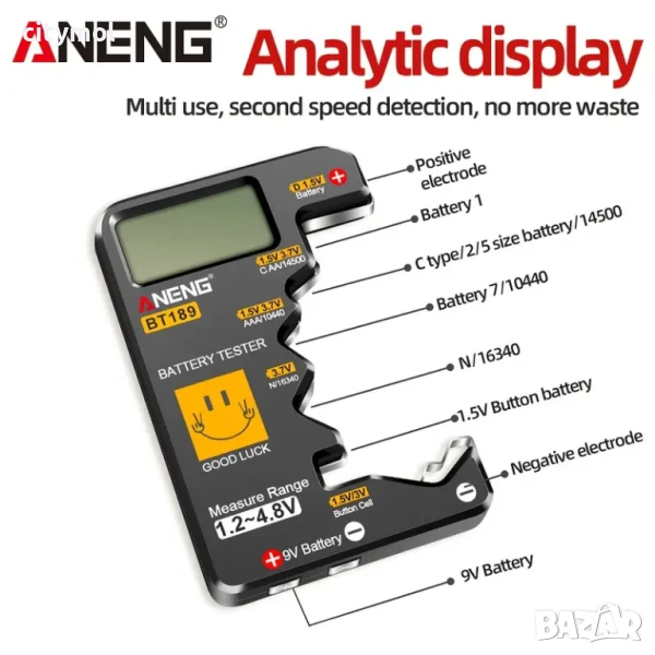 - Характеристики: C,AA,AAA,D,N,9V 6F22 батерии и 1,5V/3V бутонна клетка. Изработен от здрава пластмаса и неръждаема стомана и се захранва от 1,55 V батерия.