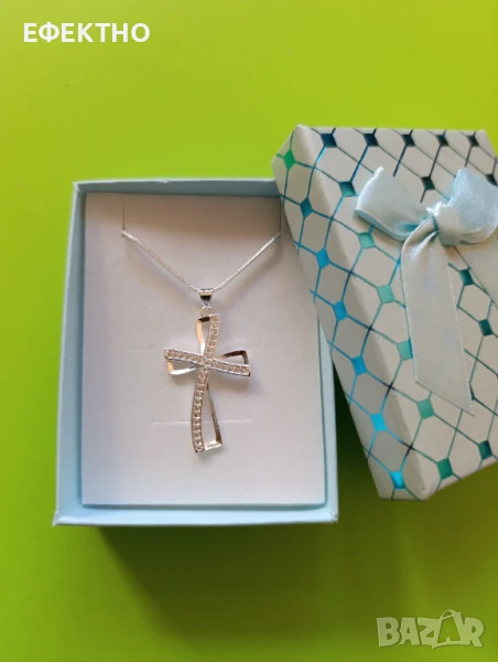 Чисто нов, сребърен синджир с кръст.В подаръчна кутия → Обява 50952656