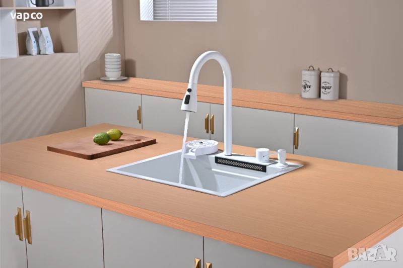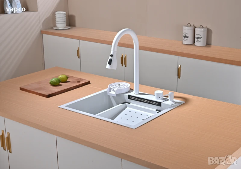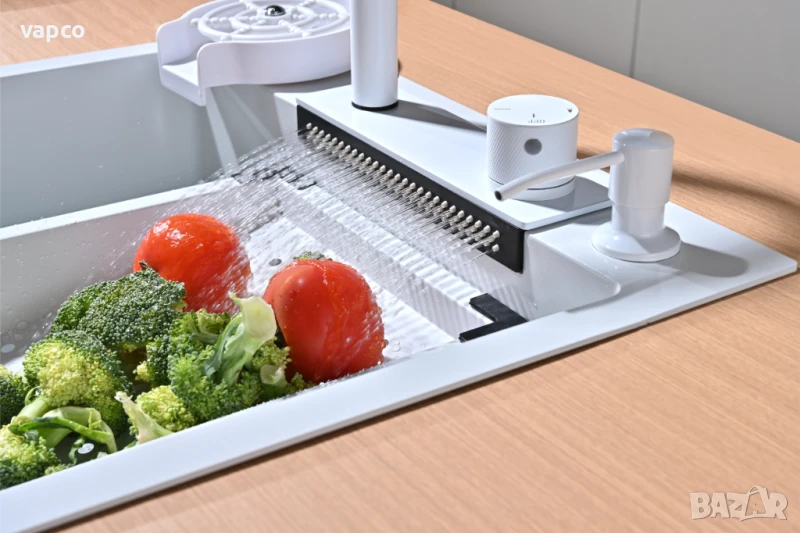 Висококачествена мултифункционална мивка от неръждаема стомана. Създава многофункционално работно пространство, за да можете удобно да миете плодове и зеленчуци с нейния