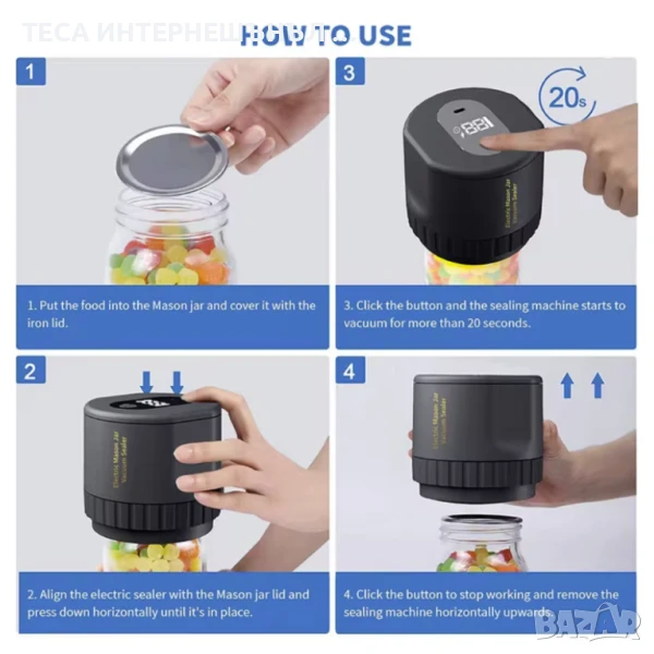 Използвайте само със стъклени буркани тип Mason (не използвайте с пластмасови).