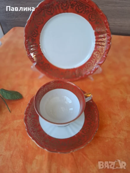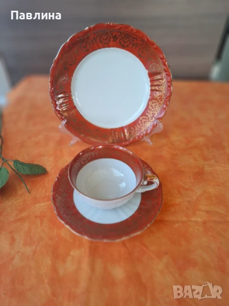 Троен порцеланов баварски сет. Голяма чиния 20 см. подложна чиния 15 см. и чаша с вместимост 150 мл. Има маркировка за произход.