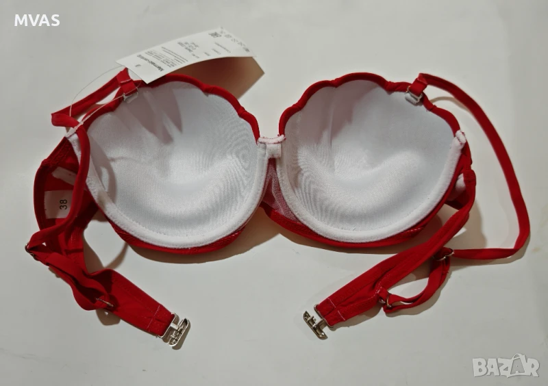 Чашка форма мида, средна подплънка отвътре, иначе държи форма, но не е прекалено твърд. Регулиращи се презрамки, които се свалят, може и без тях да се носи, отзад стандартно закопчаване. М 38 размер, отговаря, ако носите сутиени 80B ще ви стане